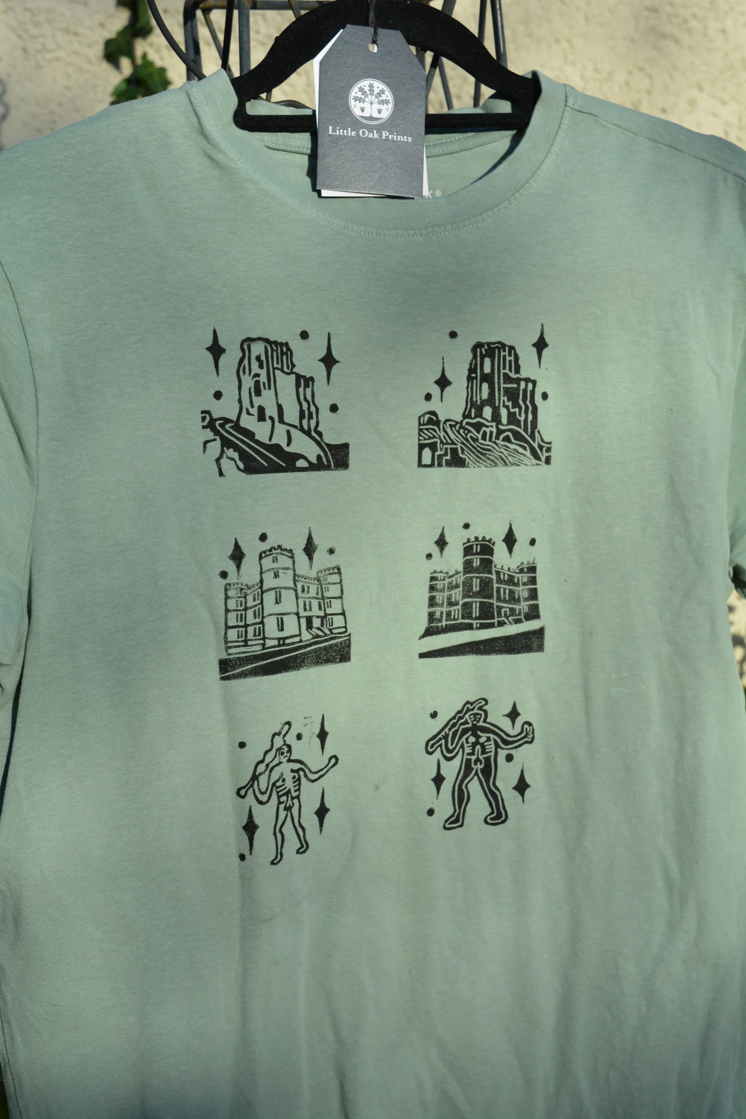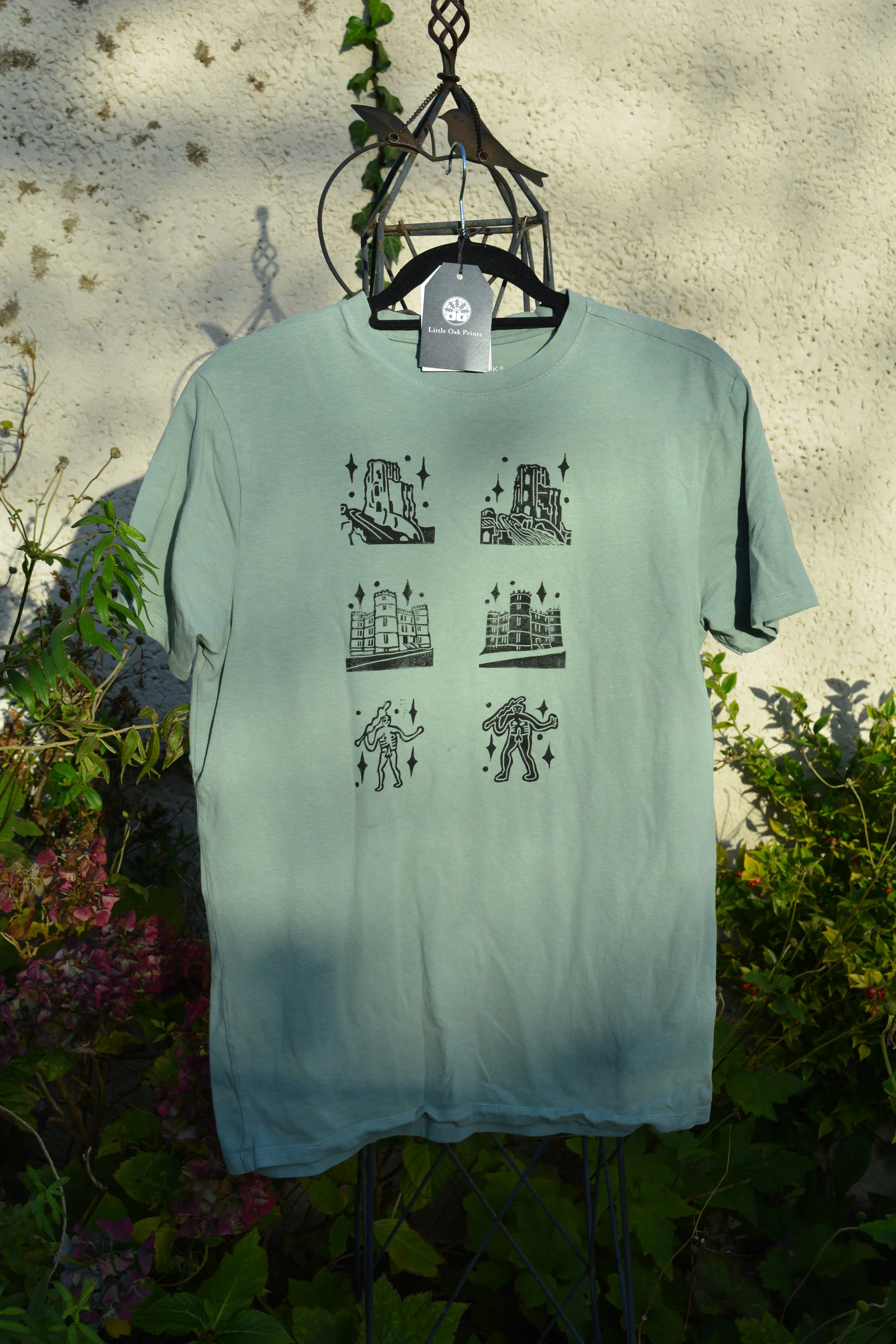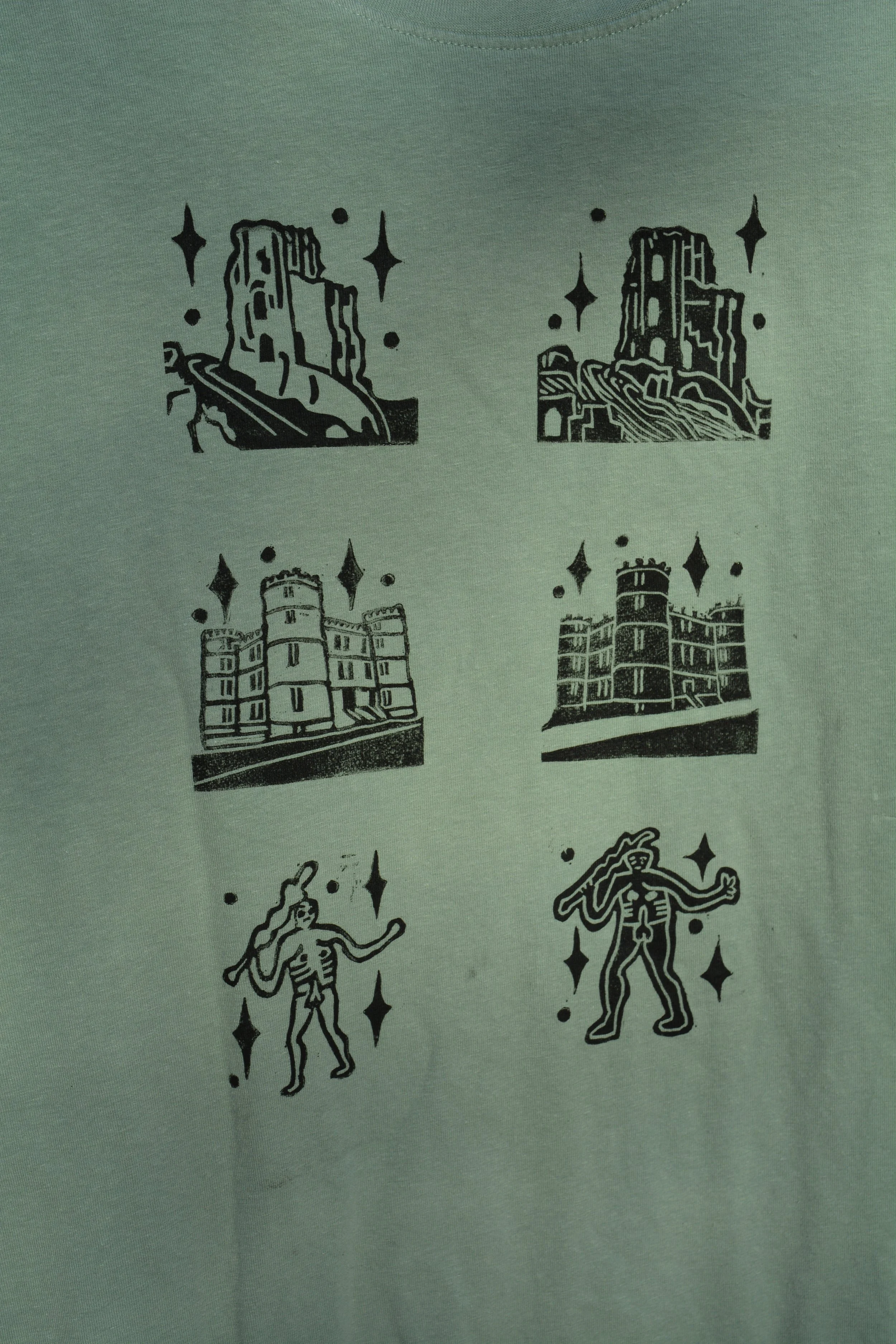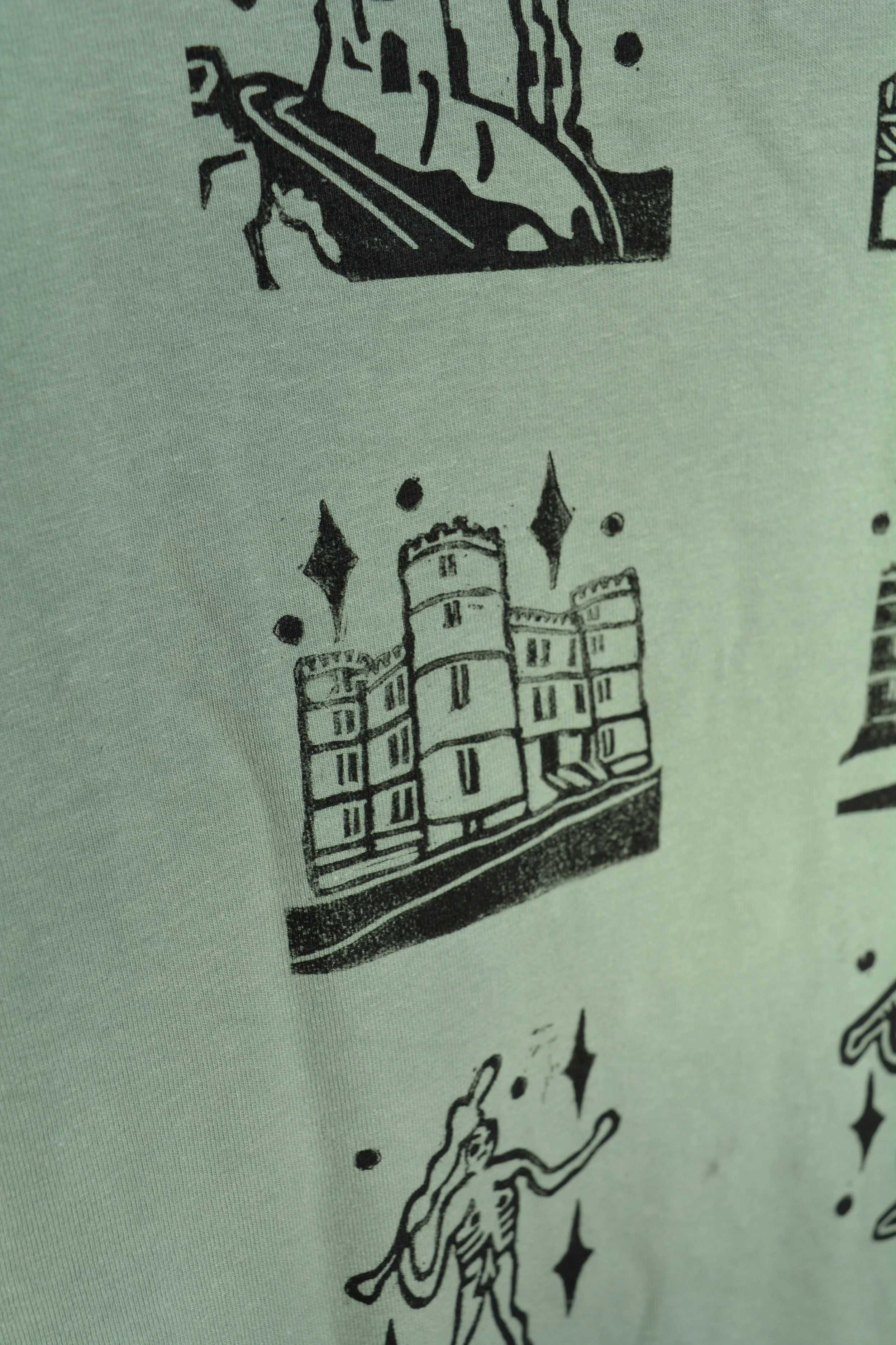 Beautiful sea glass blue coloured thrifted t-shirt, lino printed with black fabric ink which will withstand washing. Completely unique and original design, one of a kind. There is a slight ink smudge on the left shoulder of the design, this is barely noticeable but is been seen in Picture 5